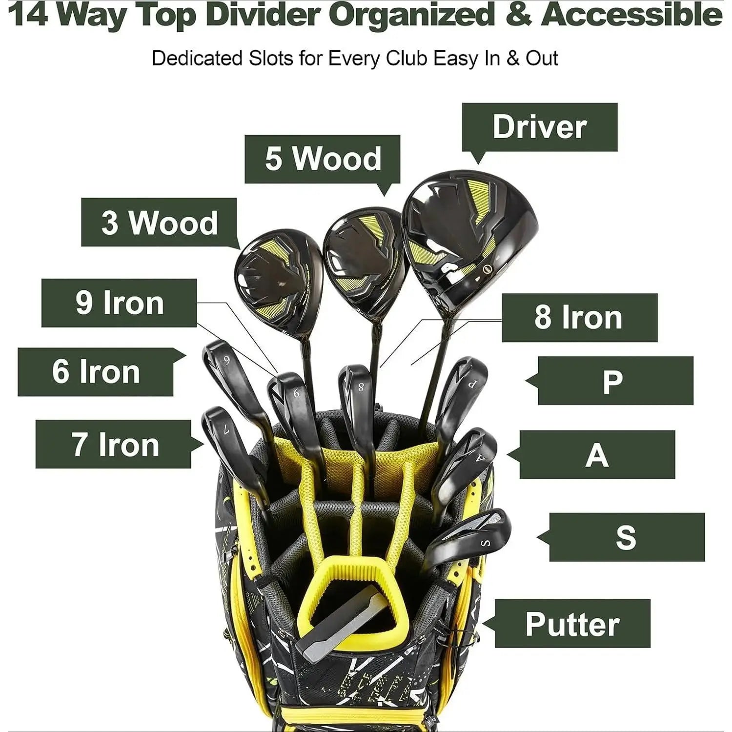 Organize your game with the YOUSE 14 Ways Dividers Golf Bag, featuring 14-way club dividers, 9 pockets, a built-in cooler, and a protective rain hood. This is the ultimate on-course companion for players who demand easy access, hydration on the go, and weather-ready performance.
