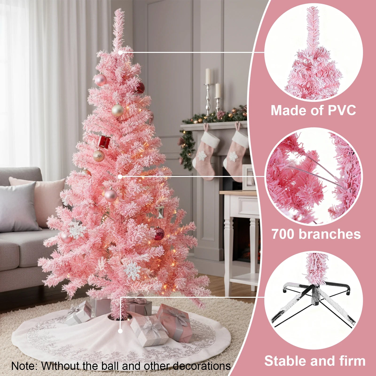 - Charming Pink Design - A flocked pink artificial tree featuring 700 branch tips for a lush, realistic silhouette and a dreamy hue that brightens any space.