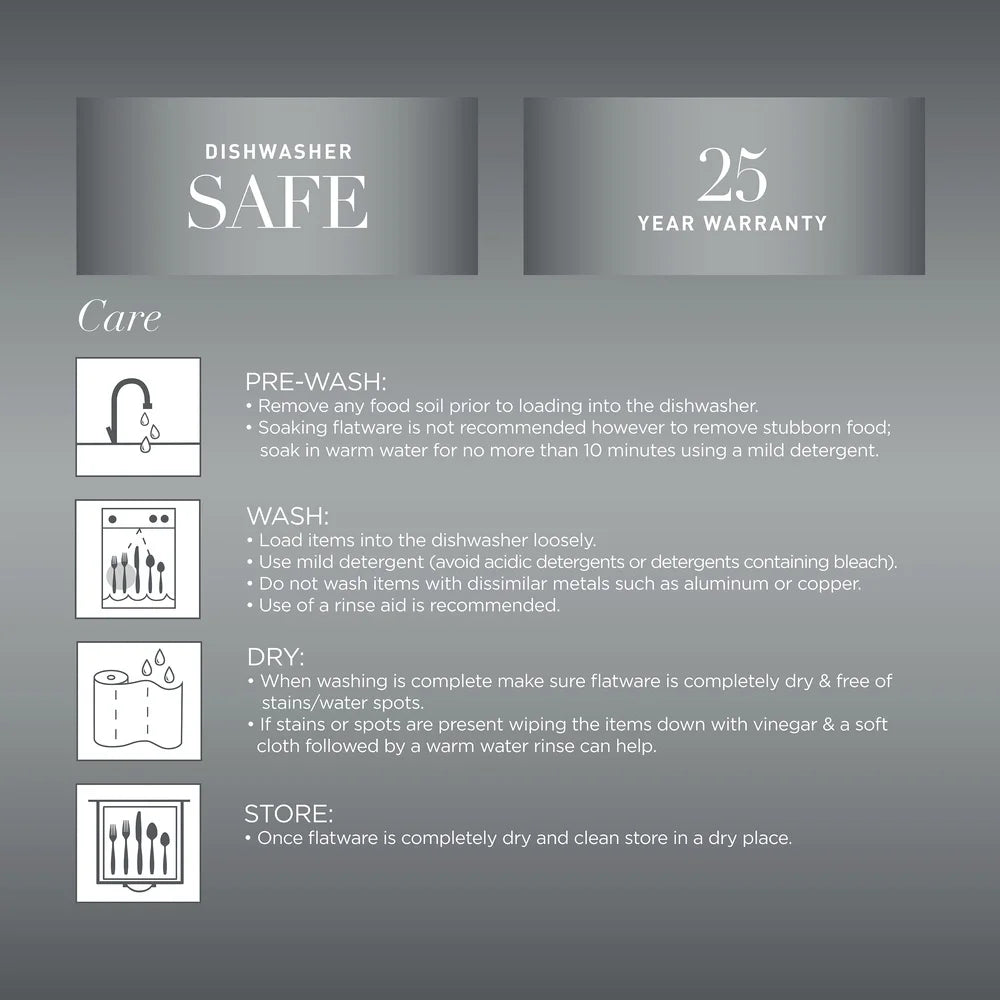 Built for entertaining, this comprehensive flatware collection includes everything you need for twelve guests: 24 salad forks, 24 teaspoons, 12 dinner forks, 12 dinner knives, 12 dinner spoons, plus 5 serving pieces for at-table service. All pieces are crafted from 18/0 stainless steel, delivering lasting shine and dependable durability.