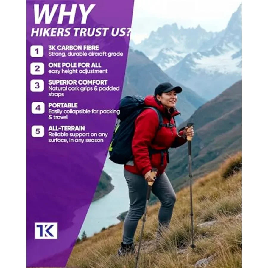 - Ultra-light carbon fiber construction for effortless climbing and extended treks.