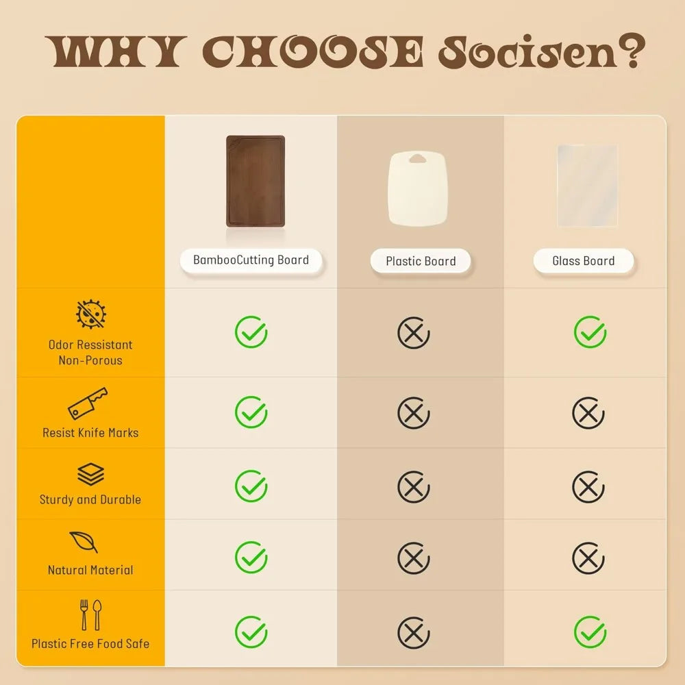 Crafted from high-quality bamboo, these boards are designed for durability and long-lasting performance. The cross-laminated bamboo construction resists warping and cracking, while the low water absorption helps keep your boards pristine with minimal care. With built-in handles and deep juice grooves, you can transport and cut with confidence, and catch juices to keep your countertop clean.