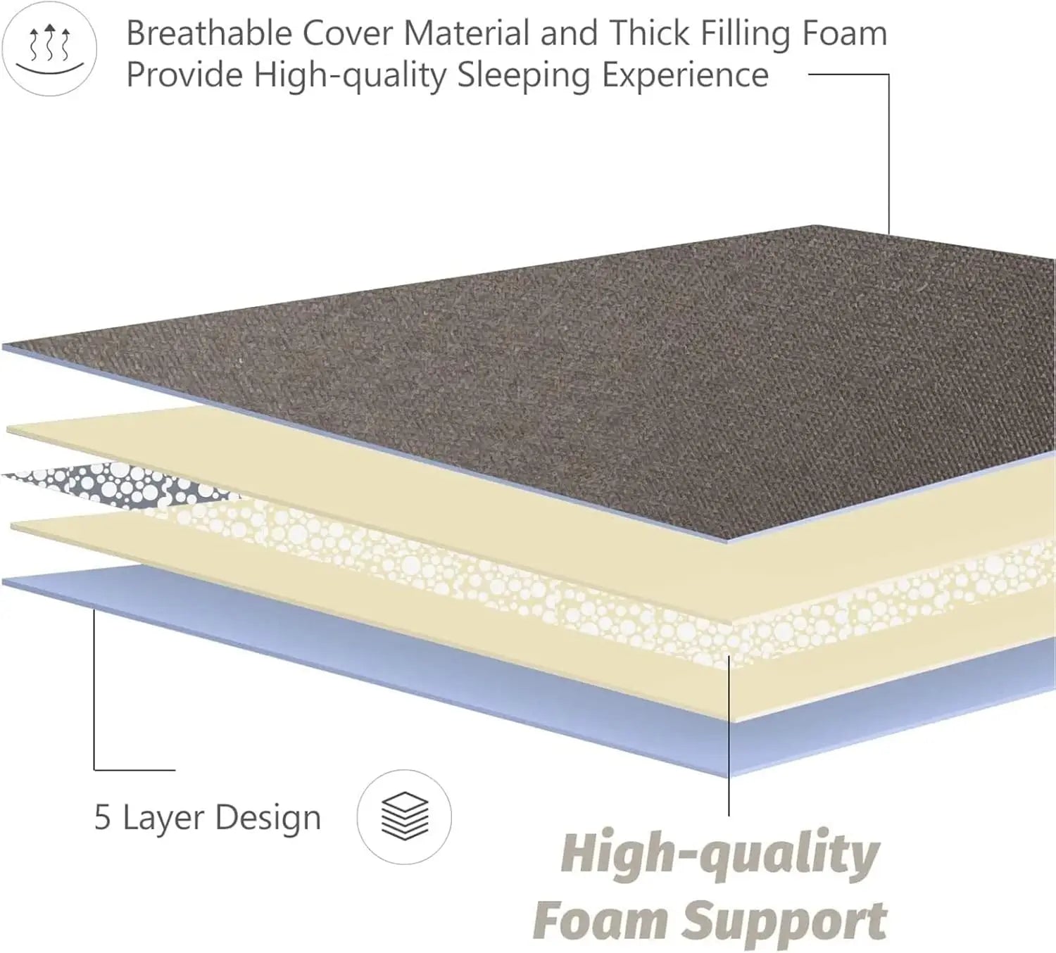 The mattress features an upgraded middle layer of high-density base support foam sandwiched between plush top and bottom layers of high-quality polyester filling. This construction reduces sagging and keeps the futon sturdy over time, while the 11" thickness delivers cloud-like comfort without sacrificing support.