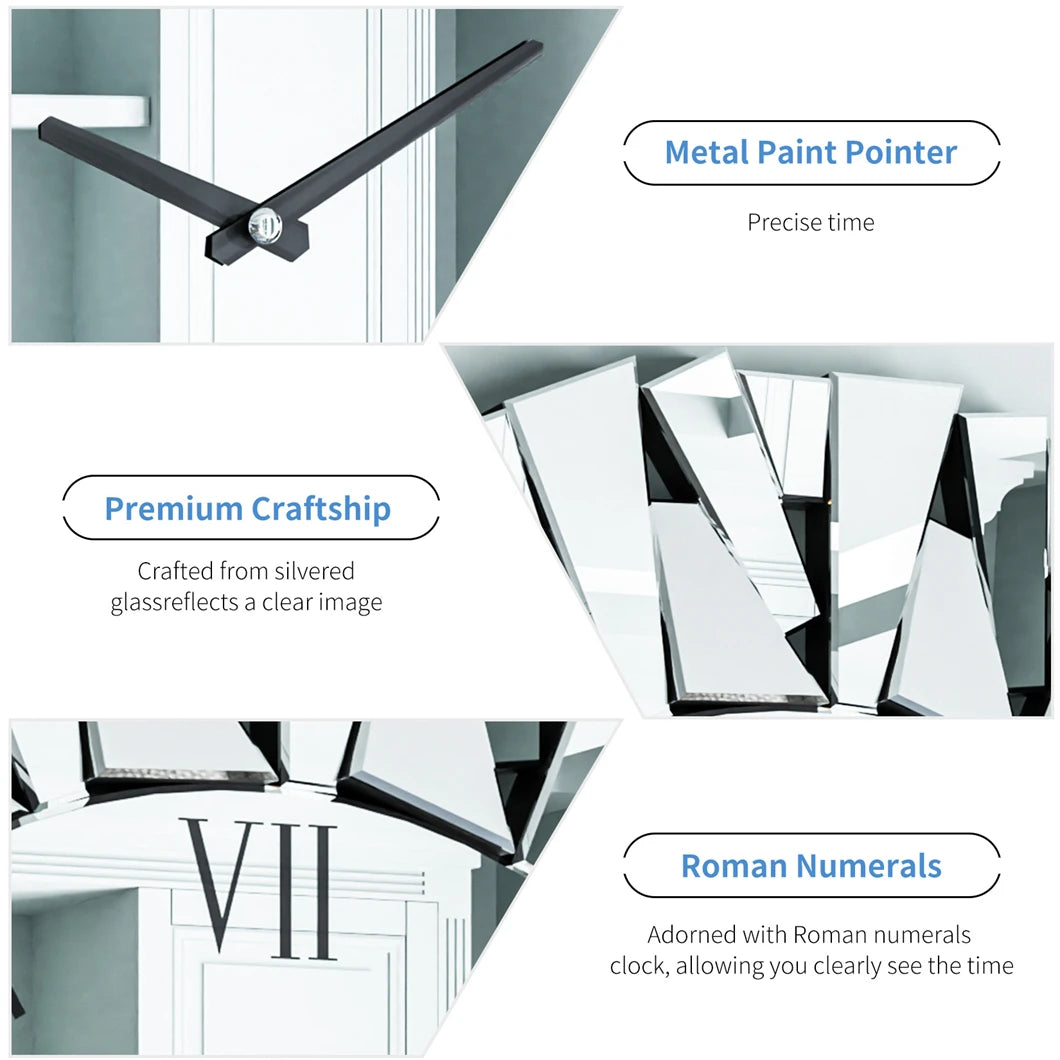 Make a bold statement with the Large Wall Clock 3D Mirrored Sunburst Edge. This 32-inch round timepiece combines contemporary style with a classic Roman numeral dial, turning any wall into a luxurious focal point for your living room, dining room, or fireplace area.