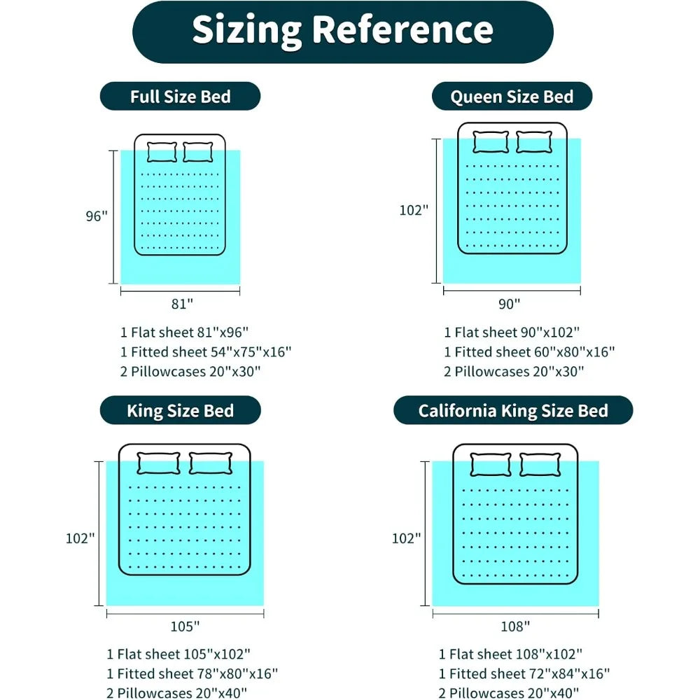 - King Size Set Contents – Includes 1 flat sheet (105 x 102 inches), 1 fitted sheet (78 x 80 x 16 inches), and 2 pillowcases (20 x 40 inches).