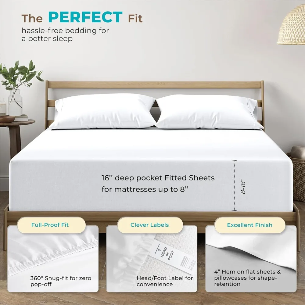 - What Comes In The Set?: Our Bed Sheets Queen Size Set Has 4 Pieces: 1 Top Flat Sheet (90” W X 102” L), 1 Fitted Bottom Sheet (60” W X 80” L + 16”), And 2 Standard Size Pillowcases (21” W X 32” L). The Fitted Sheet Has Deep Pockets To Fit Adjustable Mattresses From 8 Inches To 16 Inches Deep. Clever Head/Foot Tags Help You To Make The Bed Easily. Pair This Queen Sheets Set With A Matching Comforter And Duvet Cover To Elevate The Home/Room Decor