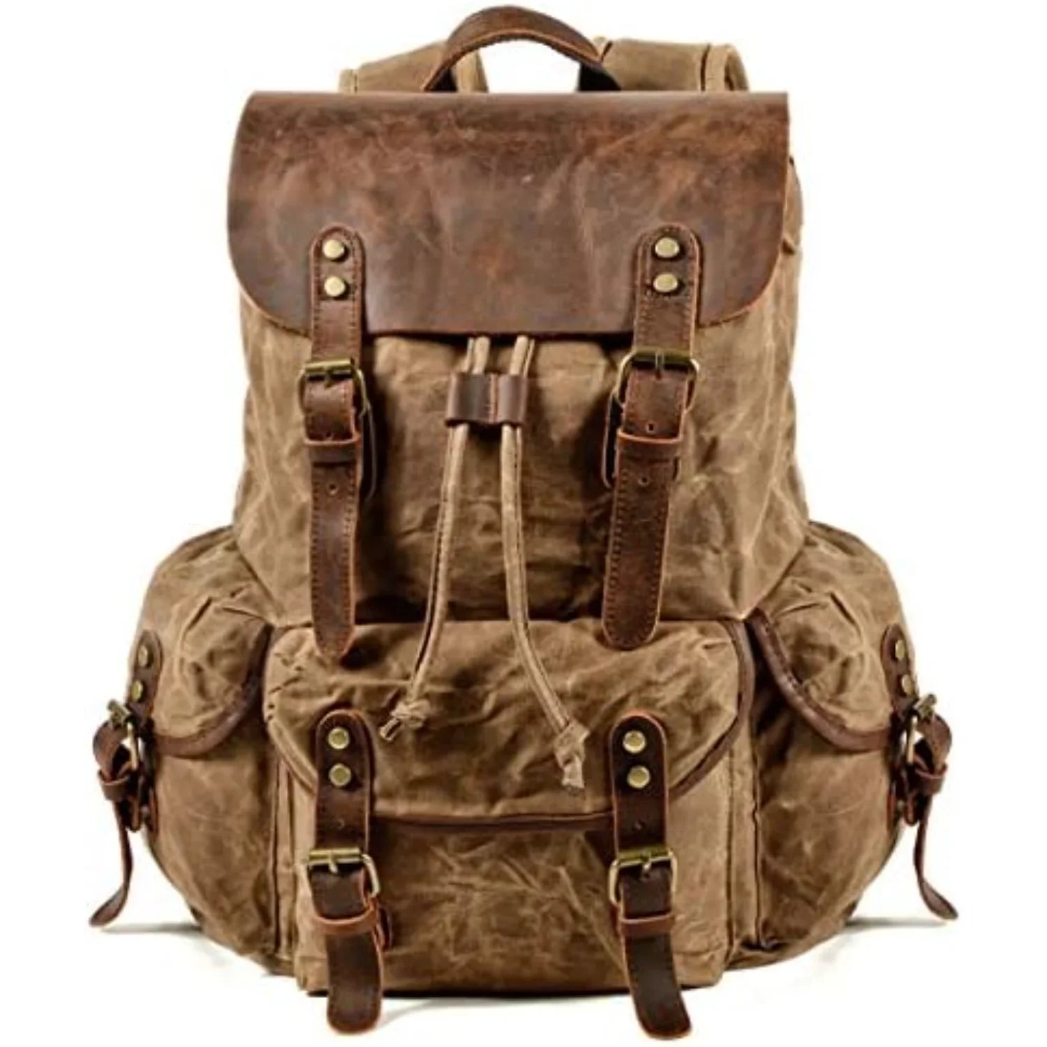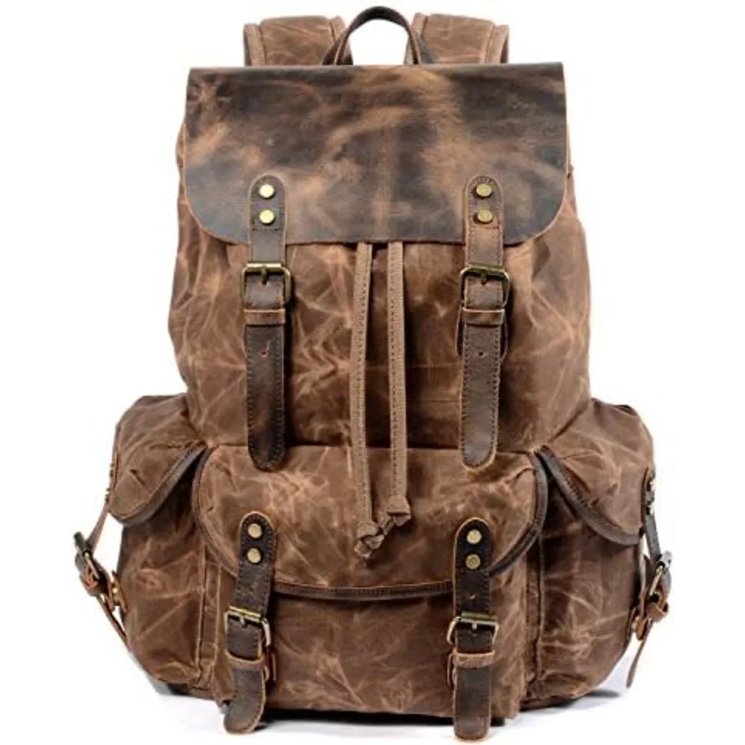Wudon Leather Backpack Men Waxed Canvas Travel Rucksack